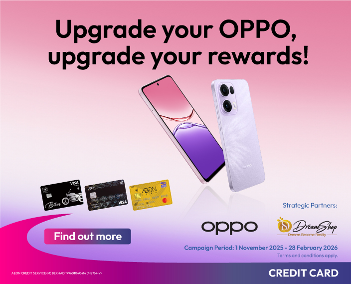Enjoy 5% OFF on all OPPO phones at DreamShop and receive complimentary gifts worth up to RM200 when you pay with your AEON Credit Card! 📱✨ 💳 Don’t miss out Shop now and save in style!