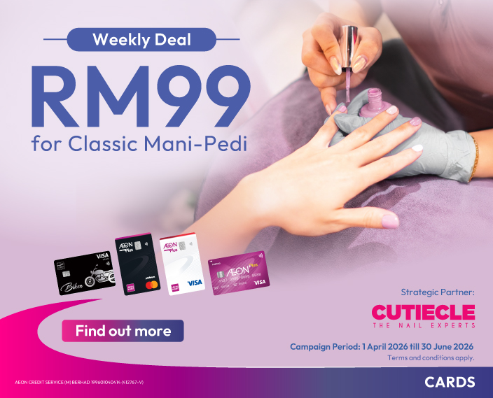 Nail your self-care routine at Cutiecle! Enjoy a Classic Mani-Pedi for only RM99 when you pay with AEON Cards. • Applicable for AEON Cards only • Promotion valid from 1 April 2026 till 30 June 2026 • Other terms & conditions apply