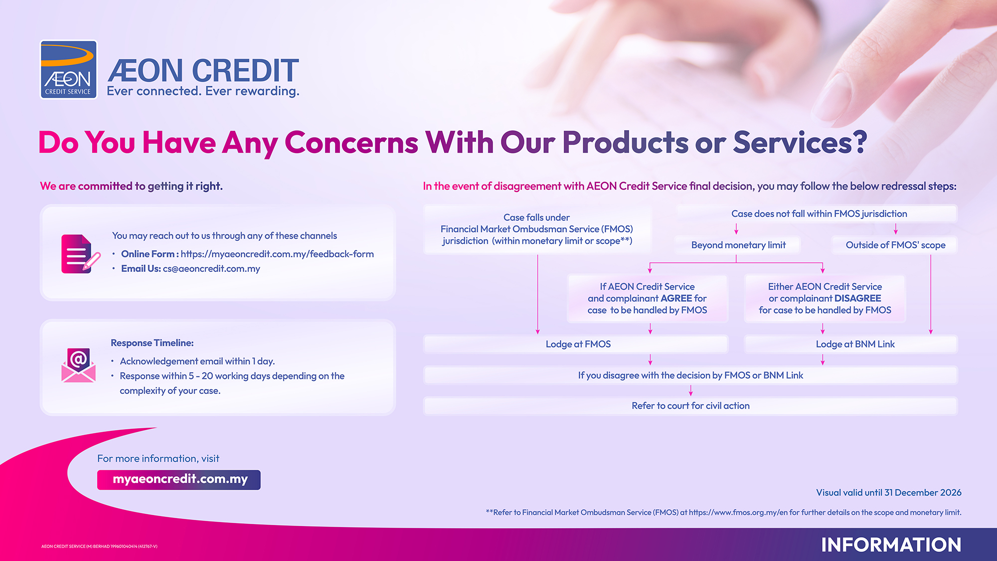 We are committed to resolving your feedback or complaint as efficiently and equitably as possible. To help us expedite the resolution, please provide us with details of your complaint or feedback via our online feedback form or email us at cs@aeoncredit.com.my (Attention to Ms. Asmah or Mr. Asri – Customer Service & Compliance Department).