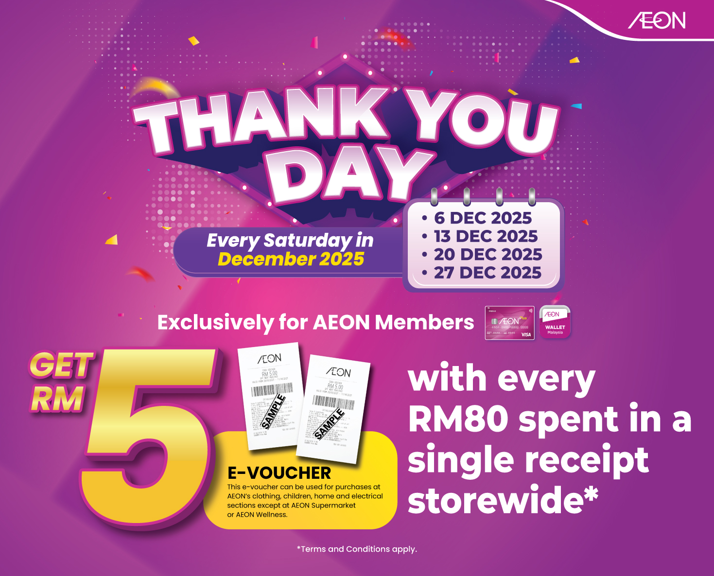 Just spend RM200 with AEON Credit Card on Lazada and get RM35 OFF. Campaign Period: 10-13 November 2025 Applicable for AEON Credit Cards only Other terms & conditions apply
