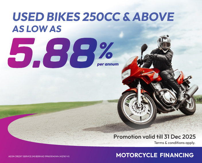 - Own a used bike 250cc & above with profit rate as low as 5.88% per annum with AEON Credit Motorcycle Financing.