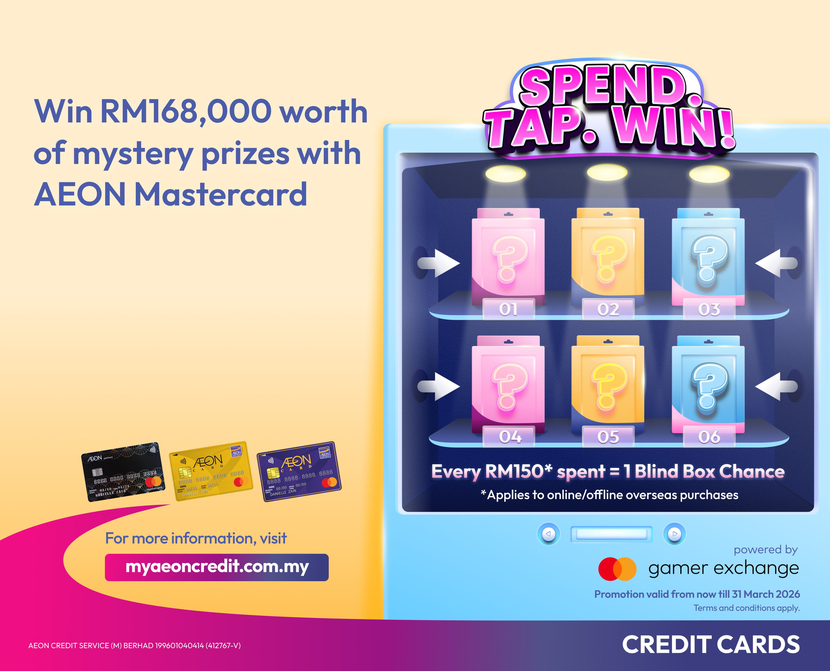 Unlock a Blind Box chance with every RM150 spent in a single transaction made in foreign currency online or when you spend in-store during your overseas travels with your AEON Mastercard. How It Works: Terms and conditions apply.Exclusively for AEON Mastercards Cardholders.
