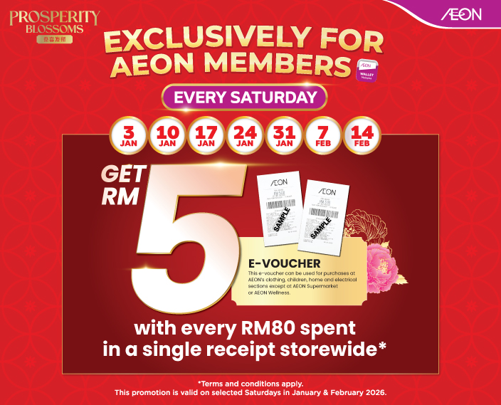 Shop & be rewarded every Saturday from January to 14 February 2026. 🎁Enjoy a FREE RM5 e-voucher with every RM80 spent in a single receipt. Don’t miss it - shop smart at AEON! *Terms & conditions apply.